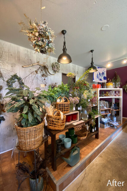 既存の段差や設備を活かしながらコーディネートし、生花や花器が映える空間に。